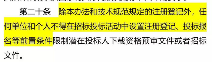 早在之前國家發改委和住建部等八部委公布第20號令《電子招標投標辦法》中也明確規定:除本辦法和技術規范規定的注冊登記外,任何單位和個人不得在招標投標活動中設置注冊登記、投標報名等前置條件限制潛在投標人下載資格預審文件或者招標文件。